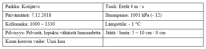 Olosuhteet olivat melko tyypilliset Keski-Suomen joulukuun alulle: Lämpötila oli juuri ja juuri pakkasen puolella, jäätä pienissä järvissä 5 – 15 cm isojen vesistöjen ollessa vielä auki. Lunta ei ollut maassa saati jään päällä vielä nimeksikään. Tuulta oli 4 m / s etelän suunnalta ja päivän yleisilme tasaisen harmaa, iltapäivästä putoili kevyesti lunta. Kuun kierron osalta reissu ajoittui täsmälleen uuden kuun päivään. Aikaisempien kalastuskokemuksieni mukaan voin yleistää etelätuulen olevan aina hyvä merkki, mutta muuten koko alkutalven kalastus oli vielä täysin uutta.