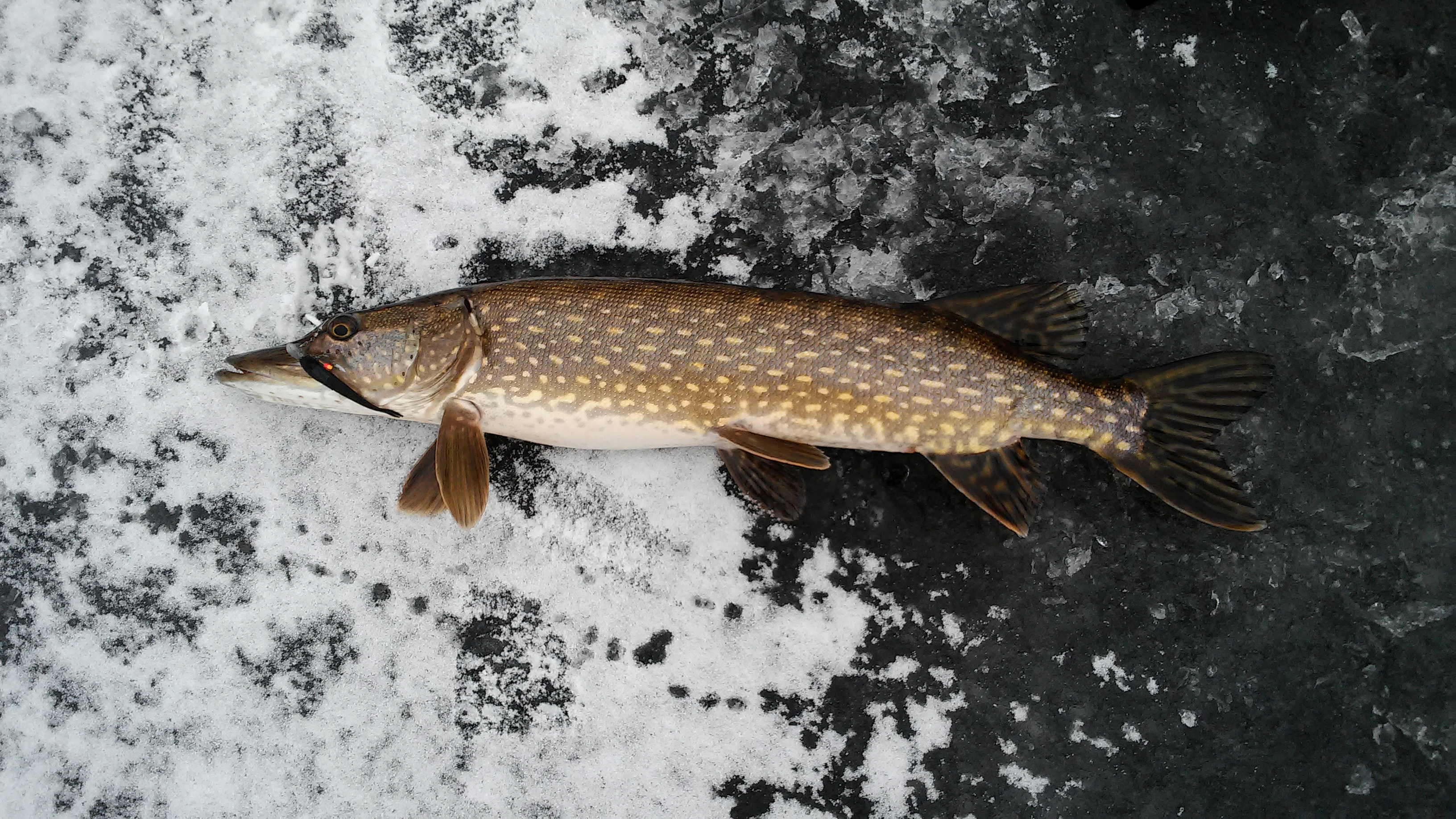 Kala veti muutaman kerran niin kovasti, että jouduin antamaan siimaa aina kelalta asti lisää. Hetken vääntämisen jälkeen sain vedettyä kalan riittävän lähelle nähdäkseni sen jään läpi. Kala oli iso, selvästi tuleva pilkkiennätykseni ja tarttunut koukkuun suupielestä. Tämä oli toisaalta helpotus, sillä siimalla ei ollut välitöntä vaaraa joutua hauen hampaisiin. Toisaalta kala harvoin on suupielestään ns. hyvin kiinni, mutta onneksi sekä pää- että kolmihaarakoukku olivat tarttuneina. Kala otti vielä pari vetoa ennen asettumistaan reiän alle. Olin varta vasten halunnut kairata oman reiän neljätuumaisella kairallani, vaikka vieressä olisi ollut Tepon kairaama kuuden tuuman reikä. Naurelin sille samalla, kun rauhallisella tasaisella vedolla käänsin kalan päätä kohti valoa ja kala lähti suu ammollaan nousemaan koko avannon leveydeltä. Vaikuttava näky!
