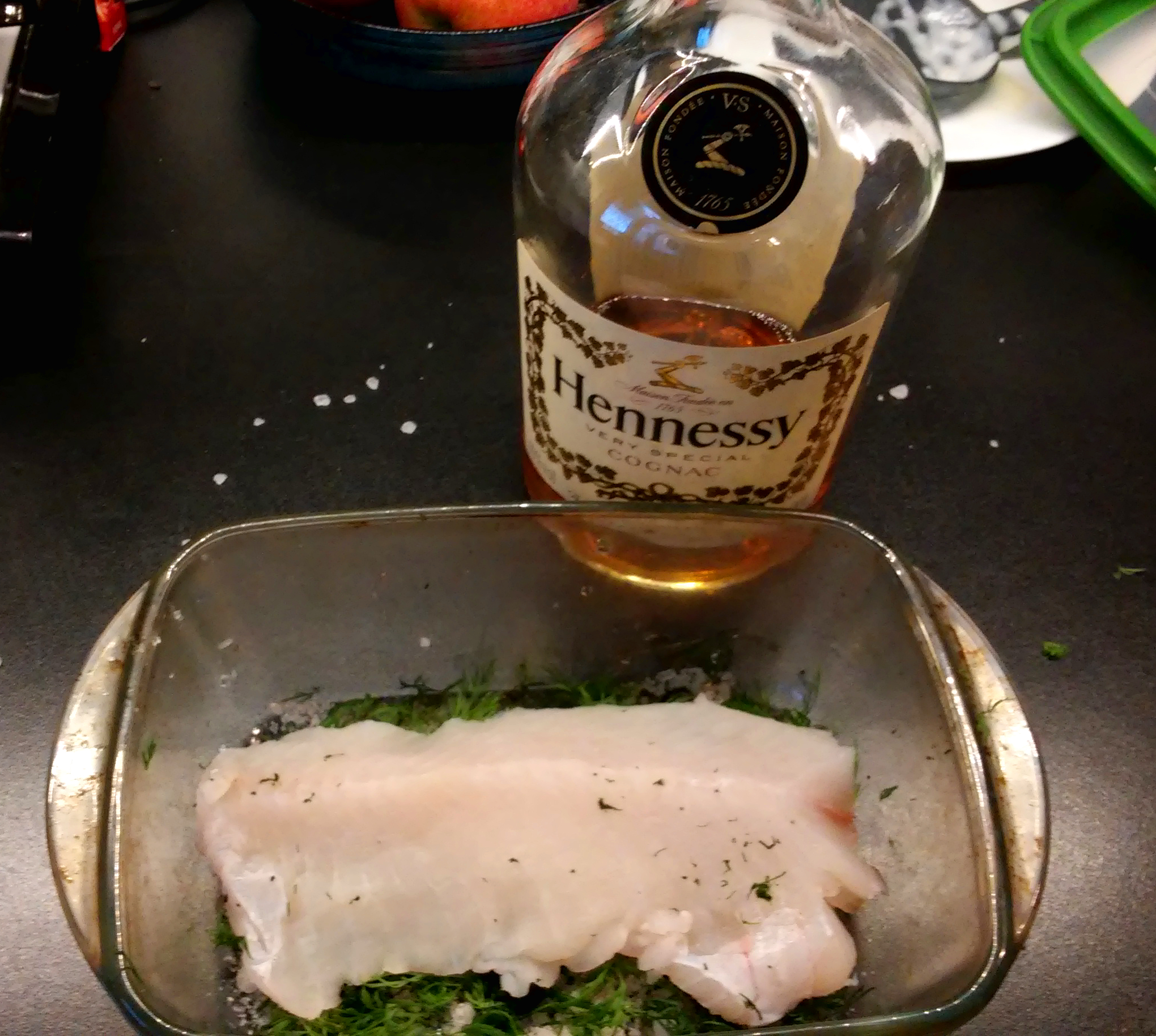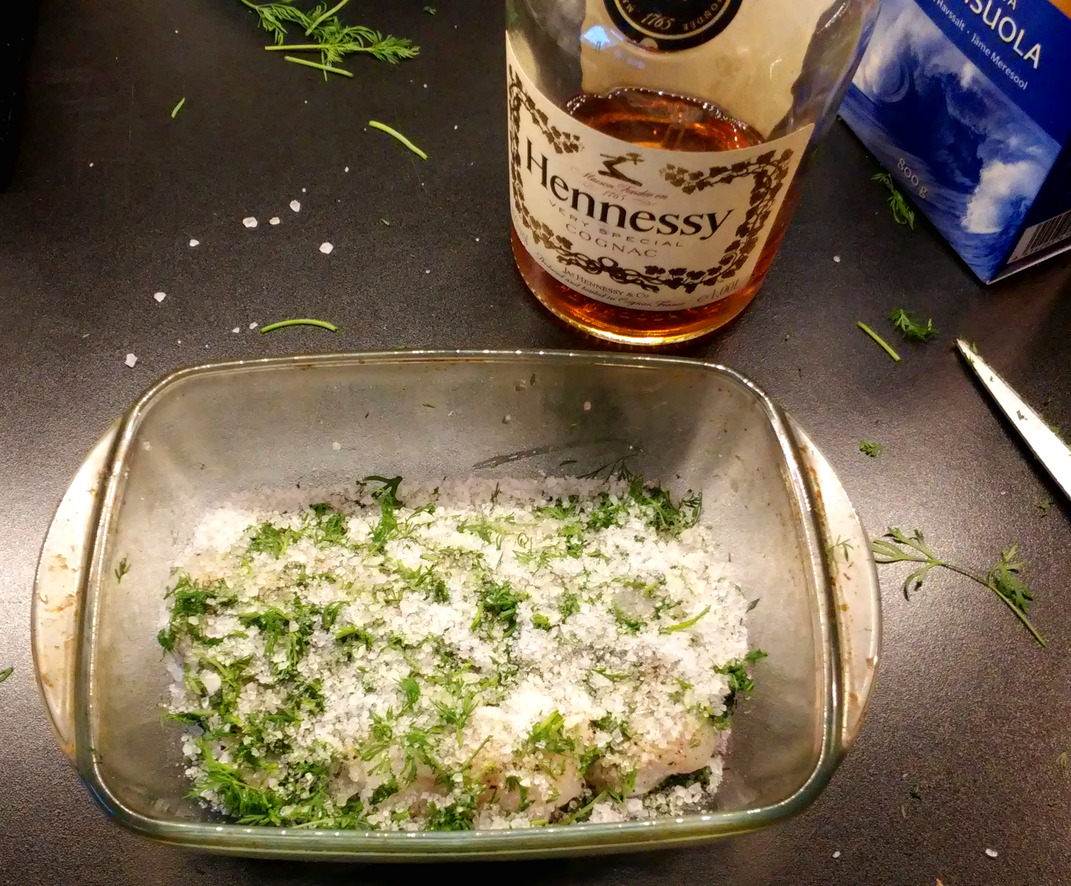 Kaiken graavauksen perustana on runsas suolaus, sekä usein sokeri, jonka sanotaan pehmittävän hieman kalan makua. Nämä kaksi miellän enemmin kalan ”kypsyttäjäksi” enkä niinkään mausteiksi. Maustepuolen hoitaa suolan ja sokerin sekaan laitettavat yrtit, pippurit tai oikeastaan mitkä tahansa makua antavat ainesosat. Me olimme saaneet konjakkigraavireseptin, joten päätin kokeilla sitä. Valmistin graavihaukea ensimmäistä kertaa ja tein verrokiksi samalla reseptillä myös lohta.