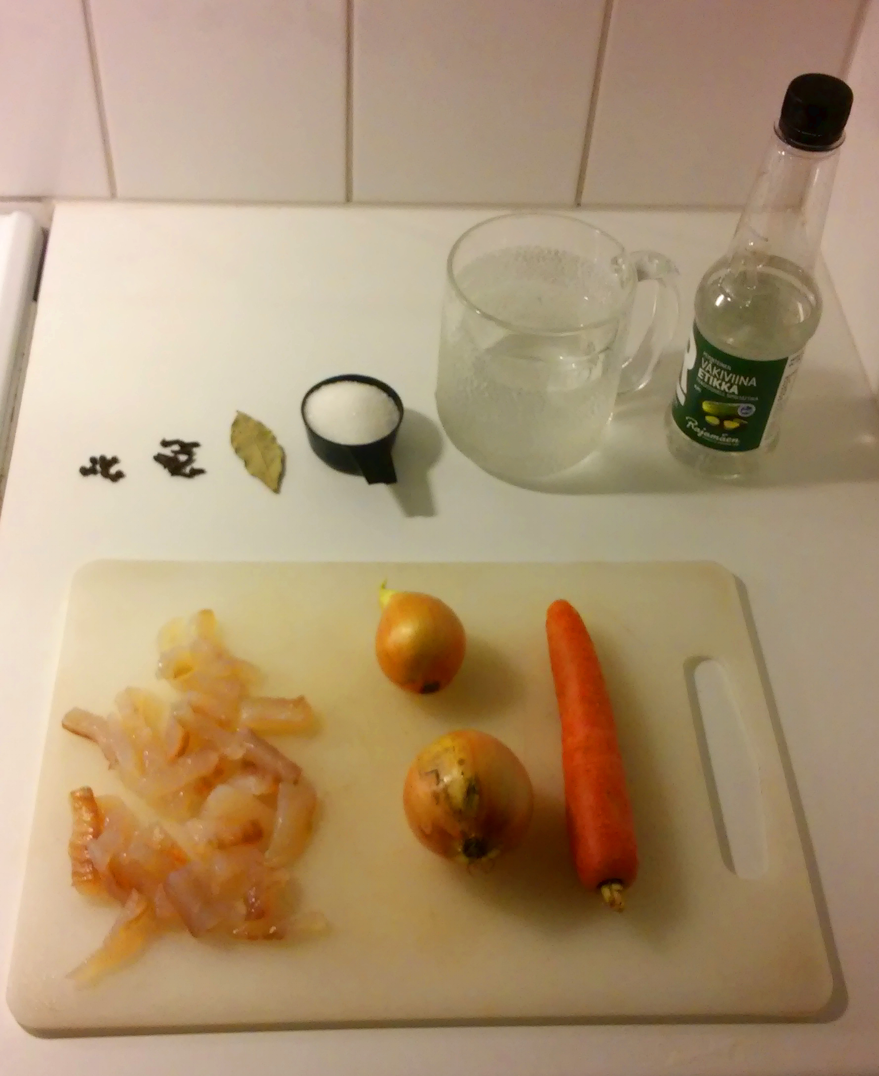 Lisäksi tarvitset puhtaan lasipurkin, johon yllä luetellut ainesosat mahtuvat. Mausteliemeen ei tosiaan tule suolaa, sillä käytettävä kala suolataan jo etukäteen.