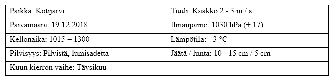 Olosuhteissa oli tapahtunut näkyvä muutos lähipäivinä kertyneen lumipeitteen vuoksi. Ensilumihan satoi näille alueille jo lokakuun lopulla, mutta jäiden kannalta tämä oli ensimmäinen lumikertymä. Edelliskerrasta hieman vahvistuneen jään peittikin nyt n. 5 cm paksuinen puhdas puuterilumikerros. Yleisilme oli lumen tuoman valkeuden vuoksi hieman valoisampi, joskin taivas totutun harmaa. Lunta tuli melko kovastikin reissun alussa, mutta loppua kohden ilma kirkastui. Tuuli kävi yhä jotakuinkin etelän suunnalta, tällä kertaa koillisesta 2 – 3 m / s. Pakkasta oli – 3 °C ja ilmanpaine 1030 hPa, eli hyvinkin samanlainen edellisen reissun kanssa. Kuun kierto tilastoitiin jo täysikuun puolelle, vaikka täydenkuun päivään vielä kaksi vuorokautta olikin.