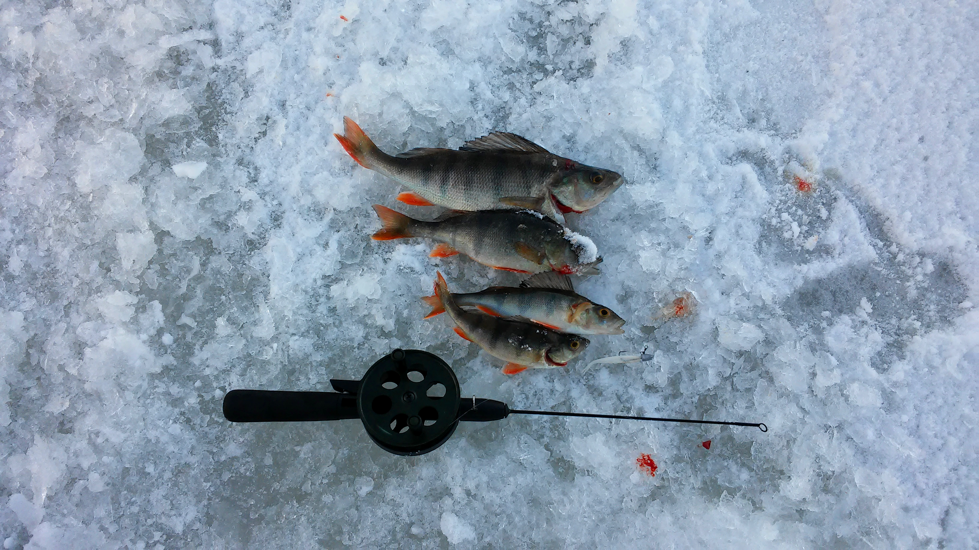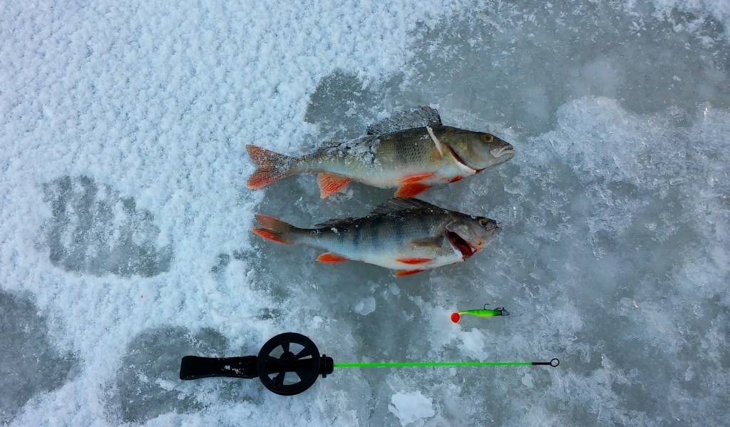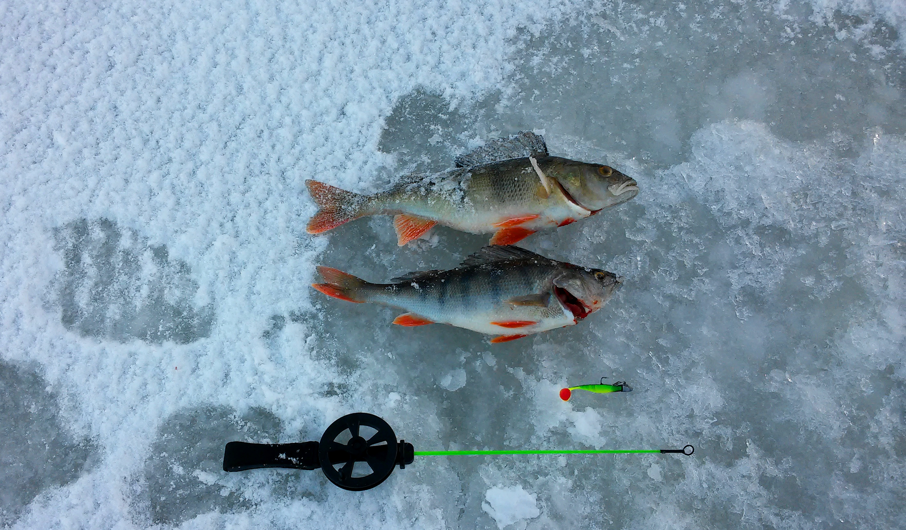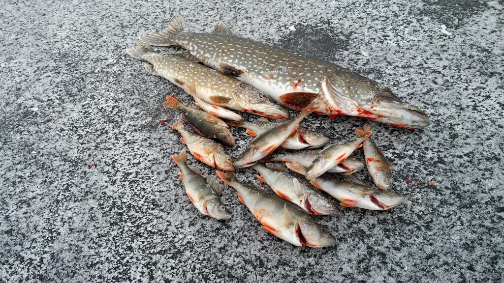 Kalojen meiningistä ei oikein ottanut selvää. Tärpit olivat pääsääntöisesti yksittäisiä, ehkä toinenkin saattoi tulla ja poikkeuksena minun neljän ahvenen reikä. Väliajat tärppien välillä saattoivat olla hyvinkin pitkiä. Samasta avannosta saattoi kuitenkin pidemmän ajan päästä tulla taas heti yksi tai kaksi, kunnes jälleen hiljeni. Tepon ensimmäinen tuli välivedestä, kun omani sain kaikki pohjan tuntumasta, joten ainakaan kovin aktiivisesti ahven ei noussut viehettä hakemaan. Aroiksikaan ei kaloja tekisi mieli sanoa, sillä ne tarttuivat yleensä hanakasti heti reiälle tultua. Kaloja luulisi olleen enemmän kuin vain ne yksi tai kaksi, sillä hetken päästä niitä sai taas lisää. Toisaalta olisiko kalat voineet olla kovassakin liikkeessä ja napsivat aina vain kohdalle sattuessa? Mutta olisivatko ne liikkuneet vain yhden tai kahden kalan ”parvissa”? Totuuttahan emme koskaan saa tietää, mutta luulen kalojen olleen sen verran liikkeessä, että parven osuessa kohdalle yksi tai kaksi kalaa ehti tulla ylös ennen kuin parvi oli jo uinut tiehensä.