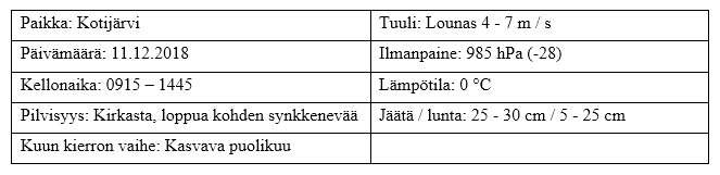 Tännekin viime aikojen kelit olivat saaneet veden nousemaan jäälle, joskin kuiviakin alueita löytyi. Aamu oli valjennut kirkkaana, vaikka lämpötila oli noussut yön aikana nollaan. Ilmanpainekin oli viimepäivinä laskemaan päin, ollen nyt 985 hPa ( – 28 ) ja saimmekin päättää reissumme lumisateessa. Napakka 4 – 7 m / s tuuli piti huolen palelusta, mutta onneksemme se kävi lounaasta kääntyen päivällä länteen, joten kaikkein karuin mahdollinen se ei ollut. Kuu oli kasvavan puolikuun vaiheessa. Lumi-loska-vesicocktailin alta löytyi vielä n. 30 cm teräsjäätä, mutta valitettavasti on todettava, että paikoin se oli muuttunut jo melko pehmeäksi. Liekö jään päälle noussut vesi pehmentänyt sitä, mutta joka tapauksessa jäätilanne näyttää koko pilkkikauttakin ajatellen melko kurjalta juuri nyt.