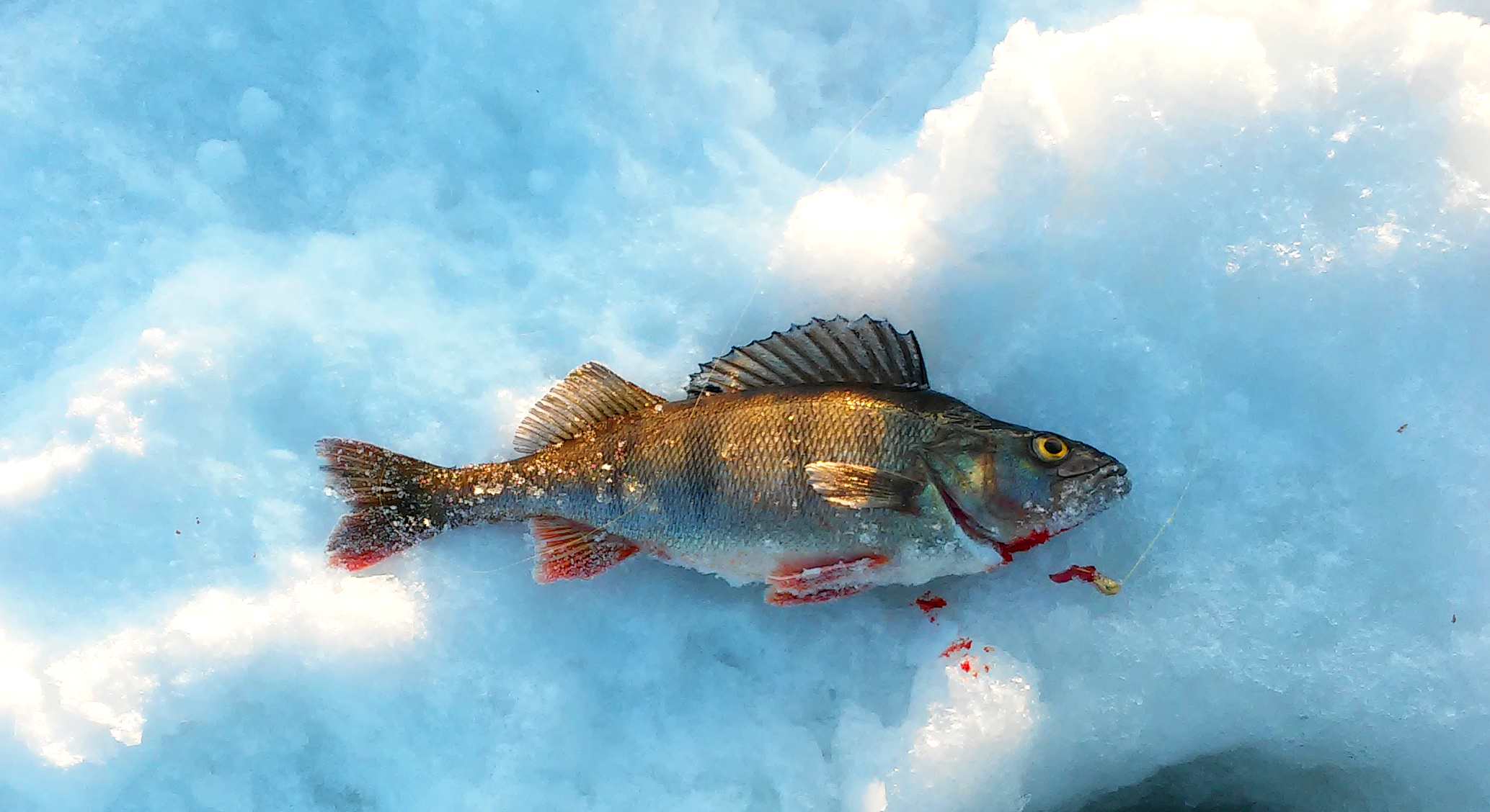 Uskomatonta, mutta totta, missasin vielä 3 – 5 tärppiä lisää eväspuuhissani. Miten se voikaan syödä juuri silloin, kun minä? Ja jos keskeytin ruokailun, odotin refleksit tanassa pienintäkin hipaisua pilkkiin, niin ei mitään. Kalat tuntuivat oikein kiusaavan tänään. Nimittäin tämän lisäksi, kun reiästä oli saanut kalan tai kaksi, se hiljeni täysin. Oli aina käytävä parilla muulla reiällä yrittämässä ja vasta sen jälkeen tähän palattua saattoi taas saada kalan. Kiertelin sekä syvän reunan syvällä puolella 4 – 5 m vettä, että matalalla puolella 2 m vettä. Sainkin yllättäen syvemmästä 8 cm hilemuikkusairalla ahvenen. Tämä yksittäinen ahven oli siinä mielessä mieluisa, että olin nimenomaan tältä vieheeltä juuri Leppävedellä odottanut paljon eikä se tätä ennen ollut antanut kuin yhden tökkäisyn. Nyt oli nielty syvälle kurkkuun asti, joten ainakin tälle raitapaidalle kelpasi.