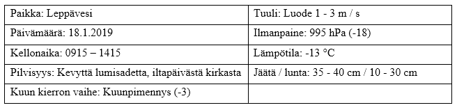 Ilma oli melko rapsakka pakkasen ollessa 13 asteen tietämillä kiristyen hieman päivän mittaan sitä mukaa, kun taivas selkeni. Aamu oli valjennut kevyessä pilviverhossa, josta myös muutama lumihiutale leijaili kevyen luodetuulen vauhdittamana. Ilmanpaine oli hienoisessa nousussa päivän mittaan, pysytellen kuitenkin yhä alle 1000 hPa:n lukemissa. Saa nähdä milloin se viimein ottaa kunnolla noustakseen ja miten se tulee vaikuttamaan kaloihin. Kuun kierto oli jännässä vaiheessa, sillä päivä tilastoitiin jo kuunpimennyksen vaiheeseen, vaikka siihen virallisesti vielä kolme päivää olikin. Totuttuun tapaan vettä oli jään päällä paikoin sen 5 – 10 cm, lunta 10 – 30 cm ja jään paksuus vajaa 40 cm.