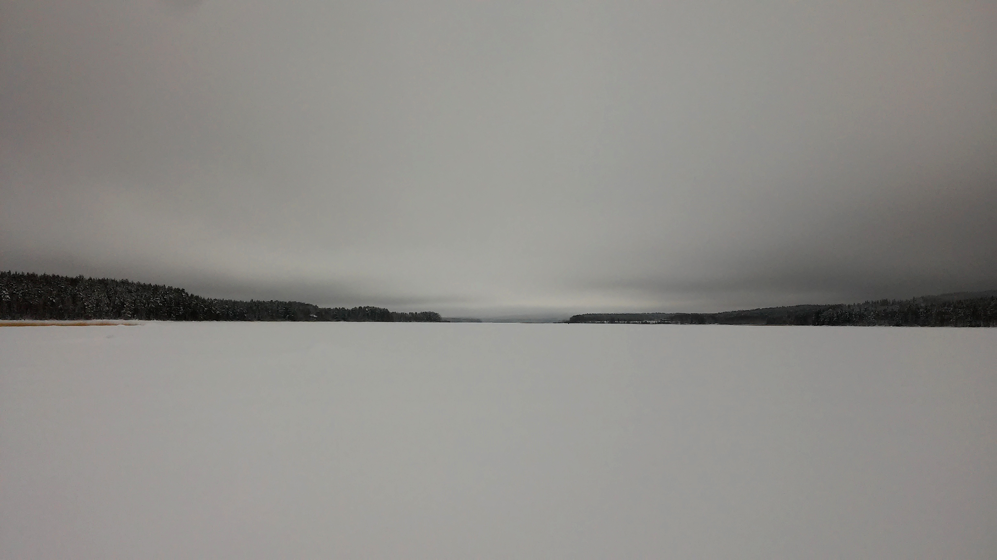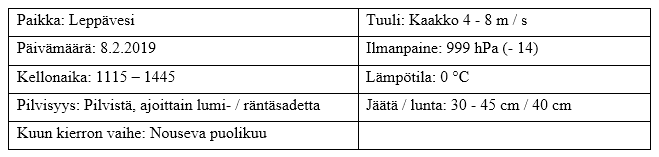 Lumisade hellitti ja sadealueet kiertelivät minut niin, etten juuri päässyt kastumaan. Tuuli puhalsi silti kovaa ja vieläpä suoraan pitkulaisen eteläisen Leppäveden suuntaisesti kaakosta, joten se keräsi vauhtia paikoitellen oikein kunnolla. Ilmanpaine oli viimepäivinä hienoisessa laskusuunnassa, taittunut edellisenä päivänä matalapaineen puolelle ja jatkoi tänäänkin laskuaan pudoten 1002 hPa:sta 997 hPa:han reissun aikana. Kuun kierto oli tasan uudenkuun ja nousevan puolikuun välillä. Jäätä oli vaihtelevasti 10 – 45 cm, pääosin huonolaatuista joka paikassa. Vettä oli jään päällä n. 10 cm ja lunta 30 – 40 cm.