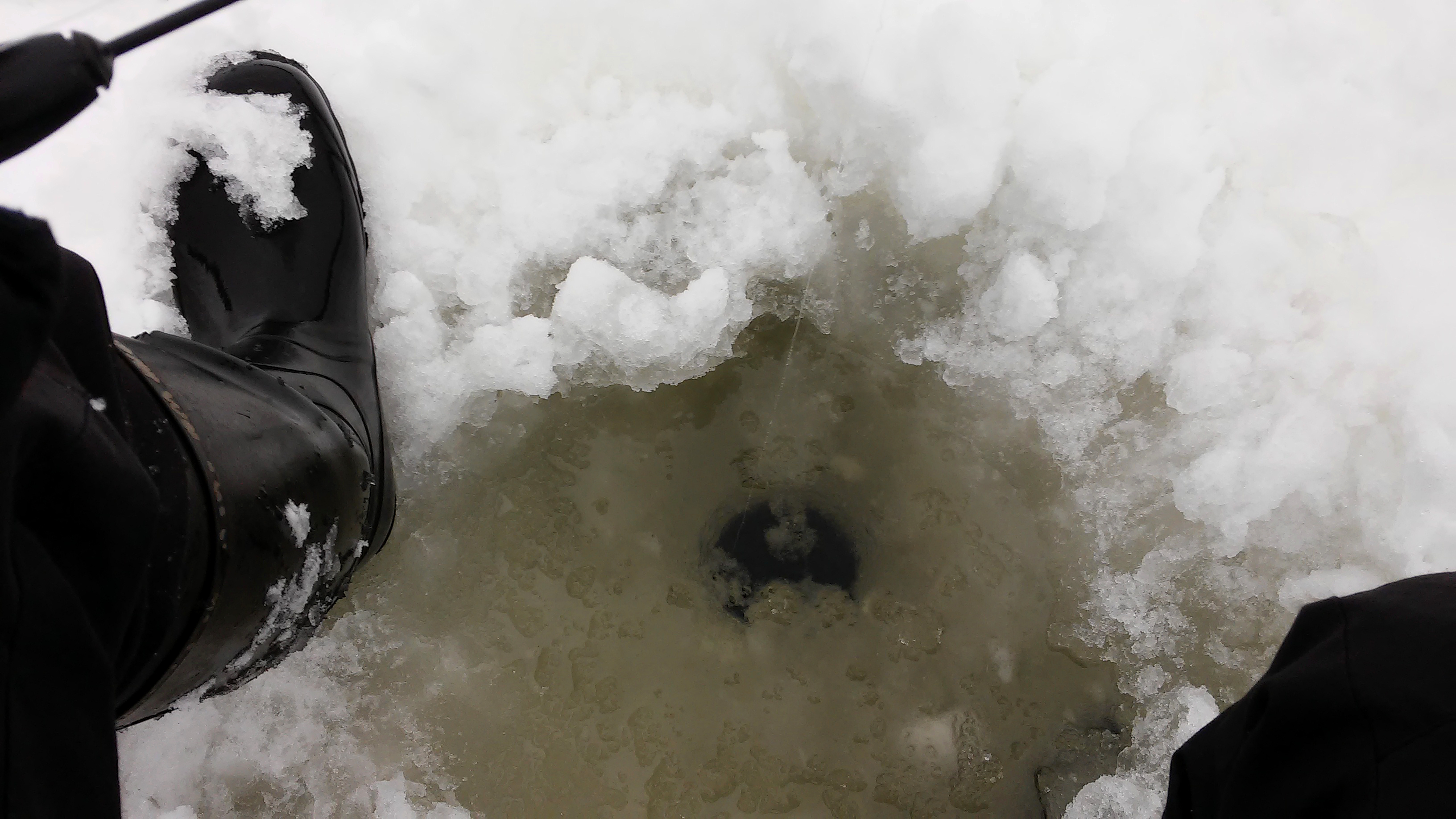 Tarvoin läpi metsärinteen, johon lunta oli kertynyt nivusiin asti. Kun 46 koon kumisaapas uppoaa syvälle nuoskalumeen, jokainen askel on suhteellisen raskas. Jäälläkin olosuhteet olivat herkkua, vettä 10 cm, jonka päällä n. 30 cm märkää lunta. Kaiken tämän vaivan jälkeen kairasin vihdoin ensimmäiset reiät vain todetakseni, ettei jään paksuus (10 – 20 cm kohvaa) ollut riittävä ja oli kehitettävä varasuunnitelma. Eipähän ollut kylmä.