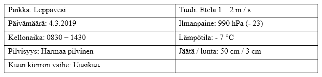 Olosuhde oli viime reissusta kuluneen neljän päivän aikana muuttunut melko radikaalisti, sillä kirkkaan lumettoman jään oli peittänyt jälleen lumi, joka satoi kaksi päivää sitten. Epäsäännöllisen muotoisia ja kokoisia lumettomia alueita oli siellä täällä, mutta valtaosa jäästä oli ohuen 1 – 5 cm lumikerroksen peittämä. Ilmanpaine, 990 hPa, ei juuri ollut lähipäivinä muuttunut. Matalapaineen puolella yhä oltiin, joskin hieman enemmän edelliseen reissuun nähden. Tuuli kävi hiljakseen etelästä, pakkasta oli seitsemän astetta ja taivas tasaisen harmaa. Jäätä oli 40 – 50 cm ja kuun kierto uudenkuun vaiheessa.