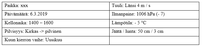 Keli oli aamun ja päivän ollut kirkkaan kaunis, mutta pilvistyi melko pian jäälle saapumisemme jälkeen. Tuulta piti olla 4 m / s lännestä, mutta todellisuudessa sitä oli hyytävän paljon enemmän. Ilmanpaine oli nousemaan päin, ollen nyt 1006 hPa. Pakkasta oli viitisen astetta, kuun kierto tasan uuden kuun vaiheessa ja jäätä reilu 50 cm. Jään päällä oli tasaisen ohut lumikerros, jota pienet laikut siellä täällä rikkoivat.