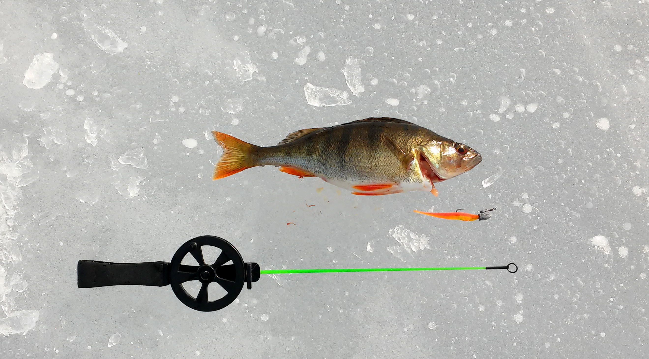 Ensimmäiset reiät osuivat vielä matalaan 2 m veteen. Erinomainen tuurini jatkui, sillä samaan aikaan opastaessani kaveria puhelimitse paikalle, sain peräti kolme kovaa tärppiä, jotka puhelin kädessä menetin. Ei monstereita, mutta hyvänkokoisia ahvenia kuitenkin. Jatkoin jonkin aikaa samalla reiällä eri jigejä ja morria kokeillen. Lopputuloksena oli 3 filekalaa oranssilla sekä hologrammimuikkusairalla.