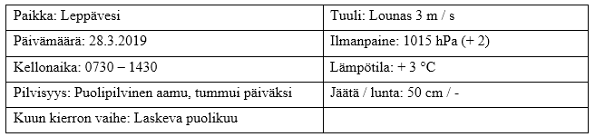 Aamu valkeni puolipilvisenä ja tummui päiväksi muutamaan vesipisaraan asti. Tuuli kävi lounaasta 3 m / s nopeudella lämpötilan ollessa + 5. Ilmanpaine oli viimepäivinä ollut kevyesti nousussa ja normaalipaineen tuntumassa, mutta kääntyi pilkkipäivänä klo 0900 laskuun. Kuu oli laskevan puolikuun vaiheessa ja kovaa hyvää teräsjäätä 50 cm.