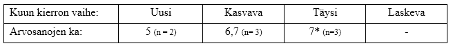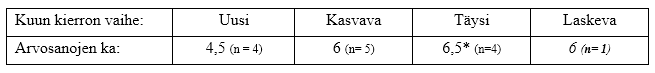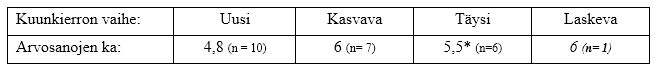 Kasvava ja täysikuu erottuvat keskiarvoissakin edukseen. Täysikuun keskiarvossa piilee sama vääristymän mahdollisuus kuin jo edellä mainittiin ja laskevan puolikuun reissut pitää jättää huomioimatta, sillä niitä tuli vain yksi.