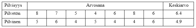 Tulos näyttää pääsääntöisesti samalta. Pilvettömien reissujen arvosanat ovat yhä korkeampia kuin pilvisellä tehtyjen reissujen. Verrattuna koko talven kuvaajaan, Leppäveden reissujen kuvaajassa huonojen 4 / 10 reissujen jakautuma pilvettömän ja pilvisen taivaan välille kärjistyi: kolme neljästä huonosta reissusta tapahtui pilvisellä ja vain yksi pilvettömällä taivaalla. Katsotaan vielä keskiarvot näistäkin: