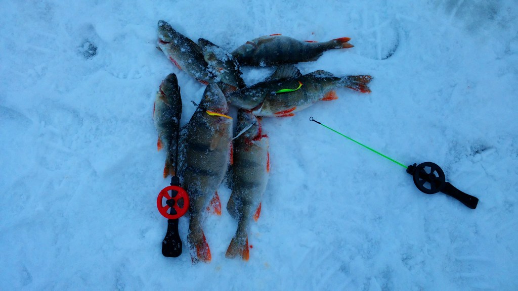 Yhteenvetona voin jälleen todeta, että jotain tuloksentynkää löytyi: Luomuvärit toimivat ahvenen jigipilkinnässä ärsykevärejä paremmin varsinkin alku- ja lopputalvesta. Keskitalvella myös ärsykevärit toimivat, joskin vain luomuvärien rinnalla, ei niitä syrjäyttäen. Pilvisyydellä ei näyttäisi olevan asian kanssa tekemistä, mutta lumen ja sitä kautta jään alle pääsevän valon määrä voisi olla yksi selittävältä tekijä. Värin lisäksi jigin uinnilla on tietty ”ärsykekerroin” ja värin tapaan vilkasuintinen Fishunter TT on hyvä vaihtoehto keskitalven pimeyteen, mutta varovaisemman uintiliikkeen omaava Saira on yleisesti parempi vaihtoehto, eteenkin kevätjäille.