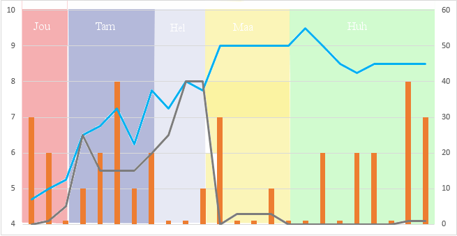 Lumen määrän harmaa käyrä on nyt ainoa, joka tässä analyysissä kiinnostaa. Kuten nähdään, lumi katosi maaliskuussa, eli juurikin samaan aikaan, kun ärsykevärit lakkasivat toimimasta! Liekö sattumaa vai ei, mutta mielestäni melko loogista, että lumen alla pimeässä räikeät ärsykevärit toimivat paremmin ja taas valoisissa olosuhteissa luomuvärit ovat avain onneen.