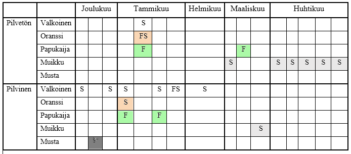 Alla olevassa taulukossa talven reissut ovat jaoteltuina pilvettömiin ja pilvisiin reissuihin kuukausittain. Merkkasin kunkin reissun kohdalle toimivimmat jigit sekä värit. Taulukosta jäivät pois reissut, jolloin millään ei tullut mitään sekä reissut, joilla yksikään jigi ei antanut kalaa ts. mikään jigi ei ollut toistaan parempi.