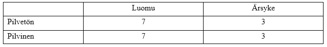 Tulos on poikkeuksellisen yksiselitteinen. Ensinnäkin luomuvärit olivat avain onneen yli puolet useammin kuin ärsykevärit ja toisekseen pilvisyydellä ei ollut vaikutusta tähän. Toki on huomioitava jo edellä todettu ärsykevärien toimivuus nimenomaan keskitalven pimeissä olosuhteissa, jolloin myös pilvisyyden ja sitä kautta auringon valon määrän merkitys lienee olematon.