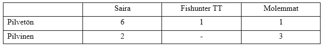 Lisäksi nostan vielä esille, että ainoastaan yhdellä reissulla Fishunter TT oli selkeästi sairaa parempi. Muina hyvinä TT-reissuina toimi myös saira. Täten on helppo sanoa sairan olevan näistä kahdesta parempi pilkkikäyttöön nykyisen datan valossa.