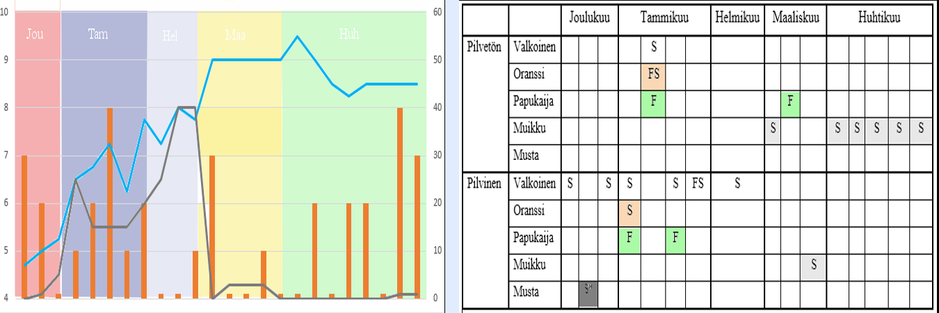 Seurattavien muuttujien osalta päällimmäisenä jäivät mieleen kuunkierto sekä vieheiden värit. Kuunkierto oli mysteeri, voisiko sillä olla jotain vaikutusta? Oli kuin olikin, samoin vieheiden värit suhteessa kalantuloon käyttäytyivät loogisesti: Valoisiin olosuhteisiin luomuväriä, tummemmissa kelpaavat myös ärsykevärit. Pilvetön taivas osoittautui pilvetöntä paremmaksi ja tuulensuunnista pohjoiset suuntaukset voittivat yllättäen eteläiset selkeästi. Ilmanpaineesta ei ottanut kuluneen talven datalla selvää. Alku- ja lopputalvi olivat yleisesti keskitalvea parempia, osasyynä todennäköisesti lumen määrä. Jään paksuudella ei sen sijaan vaikuttanut olevan merkitystä.