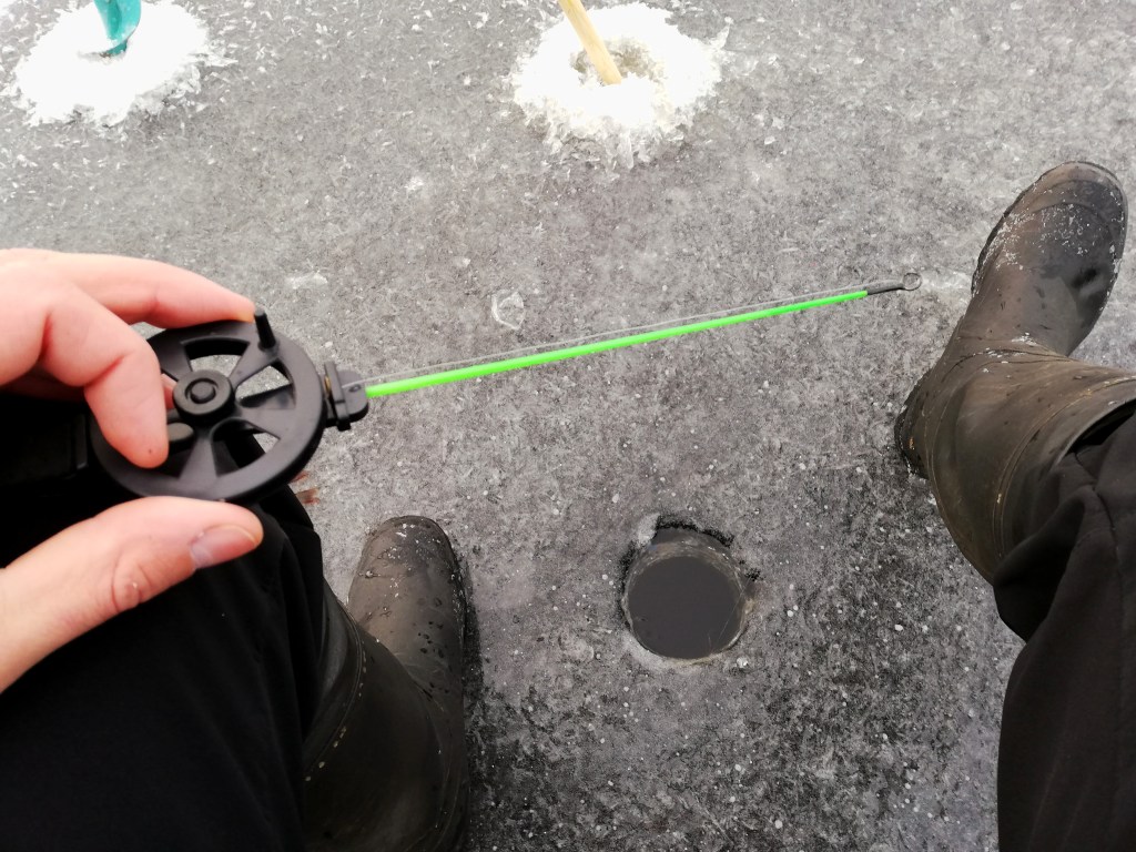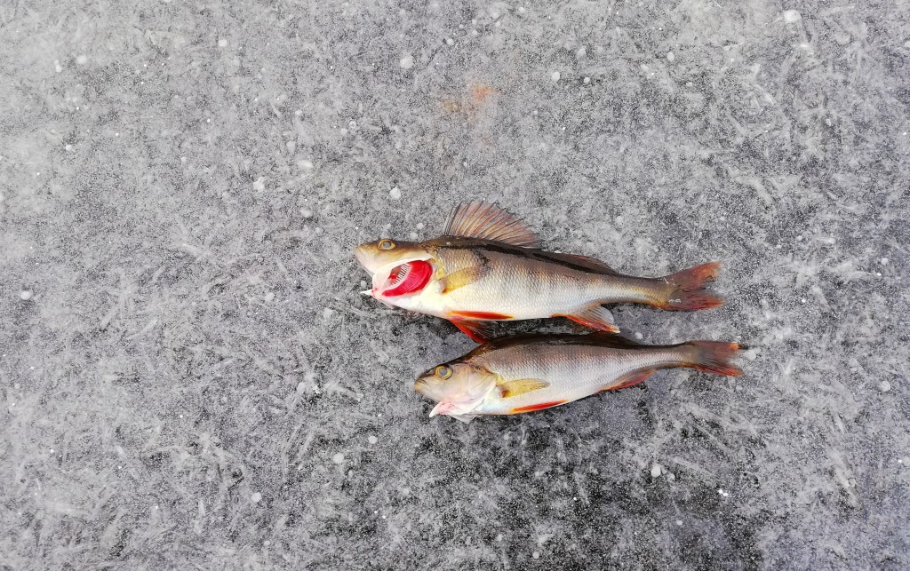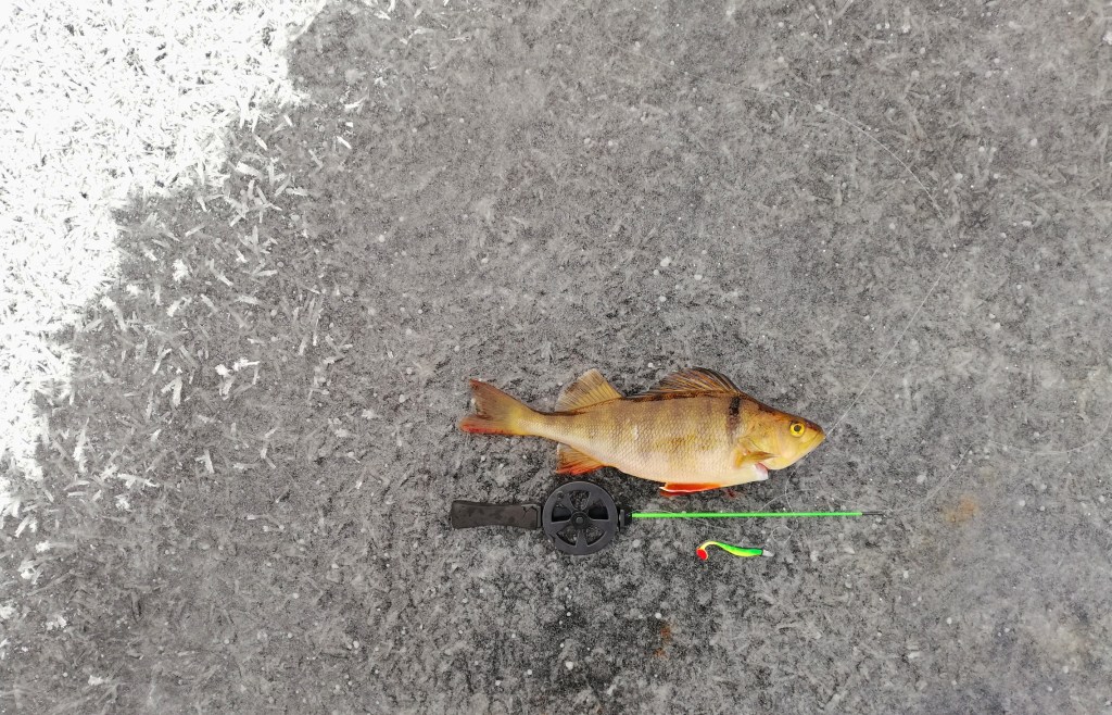 Pyörimme alueella, kunnes tapahtui omalta osaltani tärkeä käänne: Hentoinen tärppi katkaisi TT:een pyrstön. Liekö se ollut liian ärsyttävä punaisen värinsä tai herkän liikkeensä vuoksi, mutta katkeamista seurasi viiden 100 – 200 g ahvenen putki, joka huipentui päivän isoimpaan tärppiin. Se karkasi, mutta ei edes harmittanut, sillä talvi oli alkanut paremmin kuin hyvin.