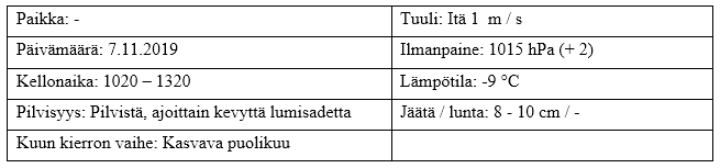 Keli oli äkkiseltään hyytävä. Pakkanen ei vastoin ennusteita laskenut aamun kymmenestä juuri lainkaan ja hento itätuuli viimeisteli kohmeisuuden. Mikä on vain hyvä, jotta saadaan järvet jäähän. Taivas oli pilvinen ja ajoittain sateli kepeästi lunta, ilmanpaineen ollessa 1015 kPa. Kuun kierron osalta elettiin kasvavan puolikuun vaihdetta.