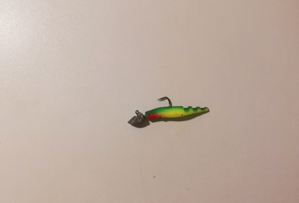 Vieheiden osalta väri tuntui olevan itse viehettä ratkaisevampi. Teppo sai hyvin kalaa papukaijavärisellä värikoukulla ja itse saman värimaailman jigillä. Kokeilin jigeistä myös oranssia sekä valkoista 5 cm sairaa tuloksetta. Muikkuvärejä en kokeillut lammen lajiston rajoittuessa vain ahveneen sekä haukeen. Jostain syystä kultamorrikaan ei muutamaa sinttiä enempää antanut. Liekö osasyy tekosurviasissa, aitoja toukkia kun ei ollut saatavilla. Jos talvi yllättää autoilijat, samaa voi sanoa kauppiaista.