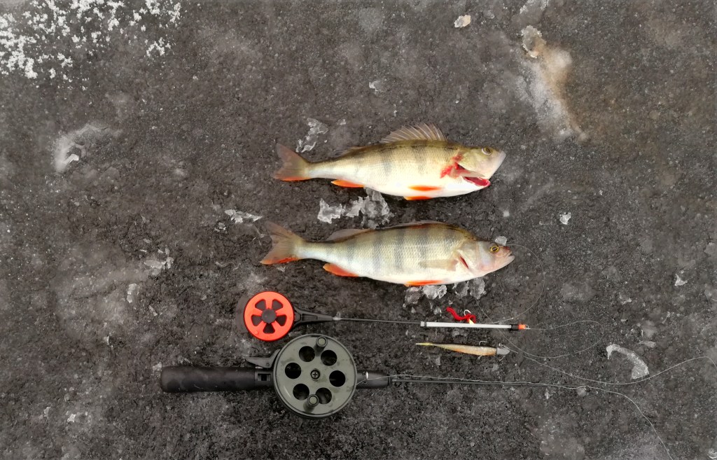 Taisi olla kolmas reikä, kun ensimmäinen pieni ahven erehtyi 5 cm Sairaan. Muuta ei siitä tullut, mutta seuraavalta nousi jo parempi n. 150 g ahven 8 cm hilemuikkulla. Ja seuraavasta samaa kokoluokkaa, tällä kertaa Fishunterilla. Juuri, kun yksi kala per reikä per viehe näytti muodostuvan päivän surullisen heikoksi juoneksi, sain morrilla kaksi ahventa peräkkäisiltä rei’iltä.