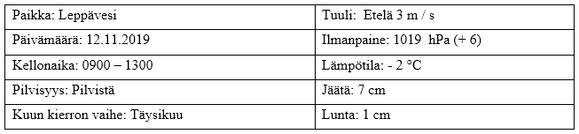 Keli oli ankea ja harmaa, vain sumu puuttui. Ilmanpaine oli hienoisessa nousussa ollen nyt 1019 hPa. Myös lämpötila nousi aamun neljästä pakkasasteesta päivän nollaan ja tuulen suuntana oli etelä 3 m / s vahvuudessa. Kuunkierto lupasi viime talveen peilaten hyvää, sillä reissu ajoittui juuri täydelle kuulle. Jäätilanne ei plussakeleistä huolimatta ollut heikentynyt, vaan sama 7 cm jääkansi ohuen ohuella lumikerroksella mahdollisti turvallisen pilkinnän.