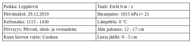 Ilmanpaine oli rajussa laskussa ja sen aisti: Toisin kuin ennustettiin, satoi, ja 6 m / s etelätuuli puhalsi räntää kasvoille lumitykin lailla astuessani metsän suojista jäälle. Ilman lämpötila oli nollassa ja kuun kierto uudenkuun vaiheessa. Jää oli paikoin lumeton, pääosin seitinohuen lumen peitossa ja paikoin löytyi 5 cm lumikertymälaikkuja. Jään paksuus vaihteli 15 cm molemmin puolin.