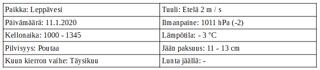 Sumu ja usva olivat hälvenneet ja kuiva pakkasilma oli erittäin tervetullutta vaihtelua. Aurinkokin hieman pilkotti, mitä nyt juuri jaksoi rinteen takaa näyttäytyä. Lämpötila oli kolme astetta pakkasella ja tuulta 1 – 2 m / s etelästä. Ei paljon parempaa voisi toivoa. Ilmanpaine oli lievässä nousussa edellispäivinä, mutta kääntyi pilkkipäivän aamuna laskuun ja yöllä oli loistanut täysikuu. Lumetonta jäätä oli tältä talvelta tutut ja turvalliset 11 – 13 cm. Helppo kulkea ja mukava kairata.