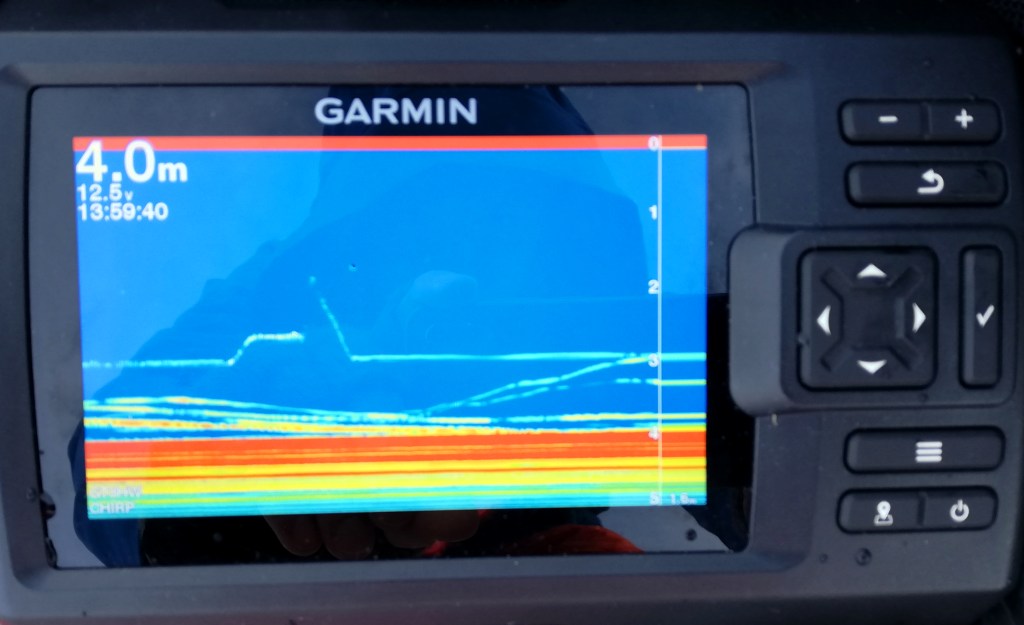 Tämä ei kuitenkaan ollut sitä, mitä haimme ja teimme pidemmän siirtymän kolmanteen paikkaan. Se ei kartassa näyttänyt mitenkään erikoiselta, mutta niin moni siitä on puhunut ja niin moni siellä tälläkin kertaa pilkki, että ennemmin tai myöhemmin piti tämäkin kokeilla. Kyseessä oli 5 – 8 m syvyinen ”kieleke” rannan tuntumassa ennen todella syvää selkämonttua.
