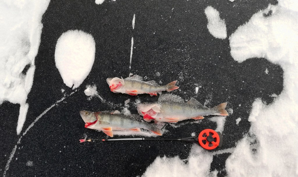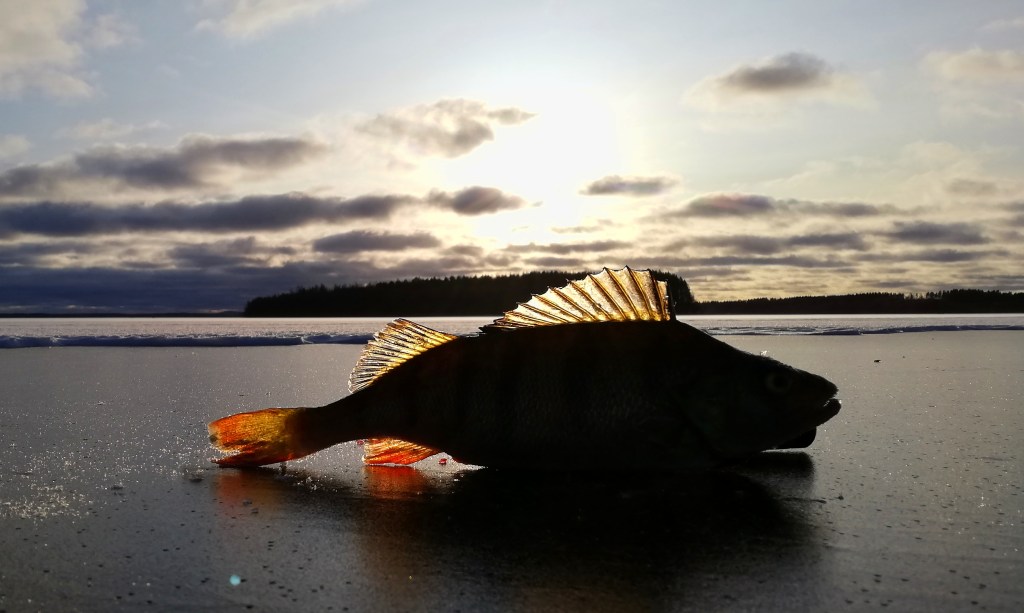 Kuten niin usein, tälläkin kertaa sai todeta matalikon olevan täynnä pientä ahventa ja särkeä. Ja niitä isompia petokaloja, niitä ei ollut. Lähdin 1.5 m syvyydestä kohti aloitusavantoja rei’ittäen n. 10 m välein. Kun syvyys oli laskenut uudestaan vajaaseen kymmeneen metriin, ilmestyivät astetta paksummat kaaret luotaimen näyttöön. Hitaasti arkaillen jokin lähestyi jigiä ja tärppäsi kuin tärppäsikin. Jäälle nousi mukava vajaa 300 g ahven.