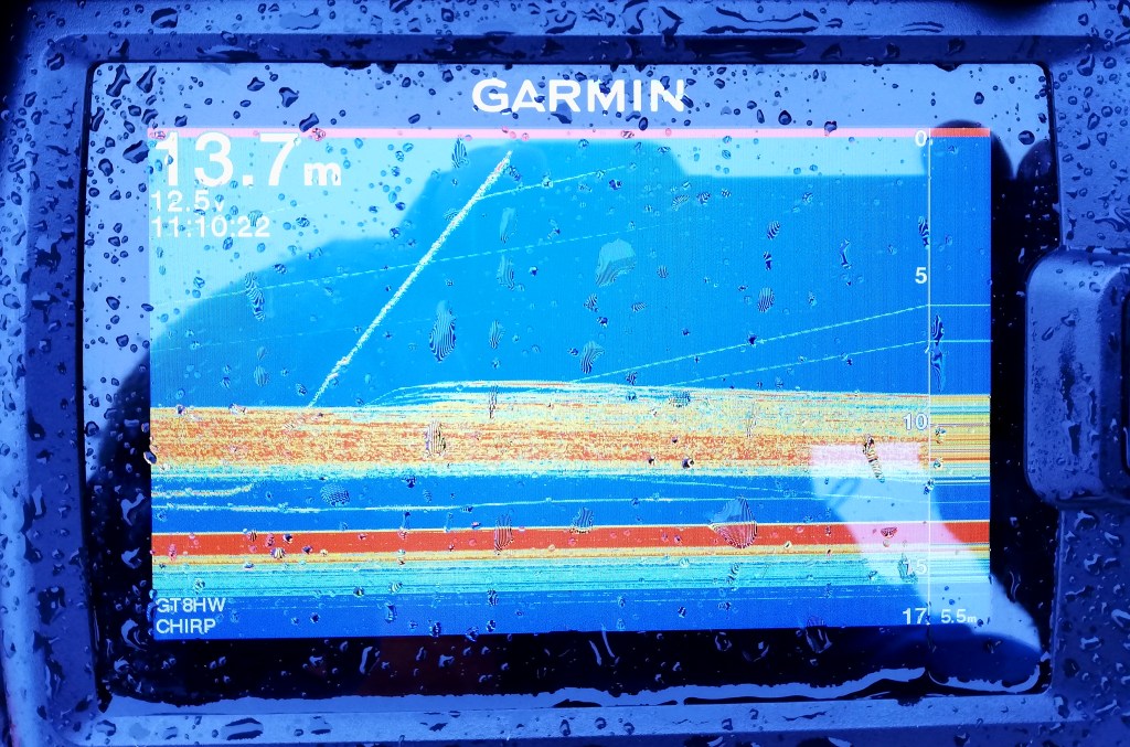 Oli valinnan aika. Vieressä oli n. 13 m syvyinen tasapohjainen alue kahden syvänteen välissä. Paluumatkalla taas n. 7 m syvyinen tasapohjainen alue sekä sen päättävä syvänteen reuna pienellä patilla varustettuna. Jompikumpi oli valittava ja kun jälkimmäisessä olin viime talvena jo heikolla menestyksellä käynyt, valikoitui tuo 13 m tasapohja seuraavaksi paikaksi.