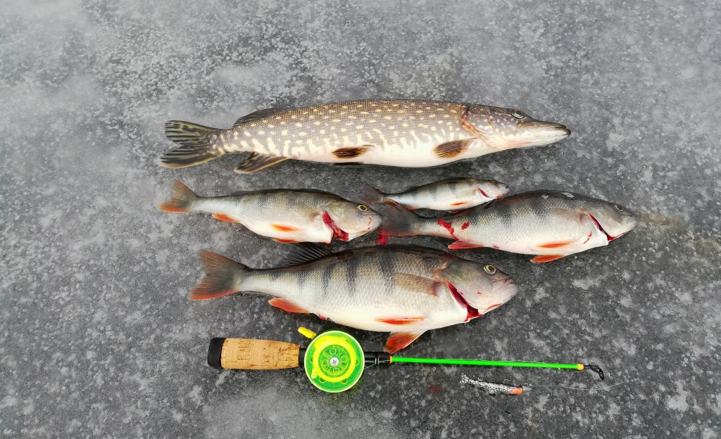 Vielä yksi ahven ehti nousta, kunnes pikkukalat uivat jonnekin pois. ”Tyhjältä ruudulta” nousi vielä hauki, joka lähti taas tällä erää ruoaksi, kun niitä nyt ”väkisin” tyrkytetään. Pilkkiaikaa oli vielä vähän ja ehdin nopeasti kokeilla sen syvänteen reunan, jonka väliltä valitsin tuon ahvenia antaneen paikan kanssa.