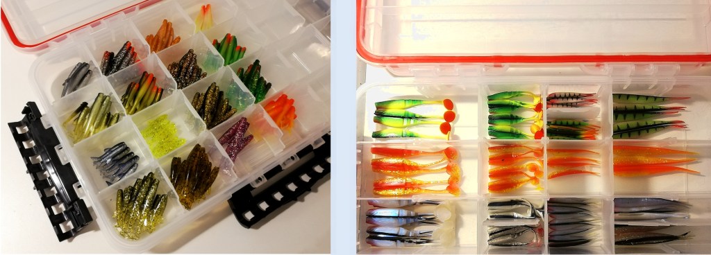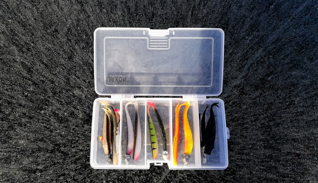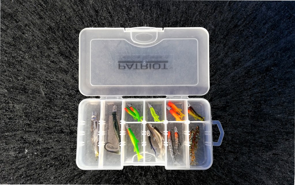 Miksi rasiat ovat niin tyhjiä? Pidän mukana yleensä vain kahta kappaletta per väri. Toinen koukutettuna, toinen varalla. Loput säilytän tiiviissä rasioissa kodin lämmössä parhaan mahdollisen säilyvyyden vuoksi. Repun rasioissa pyöriessä jigit menevät usein mm. mutkalle, mikä vaikuttaa suoraan niiden uintiin ja pyytävyyteen.