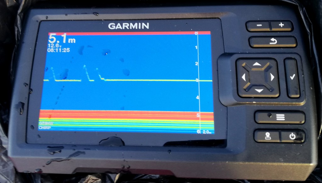 Toki viimeksi riemu repesi vasta klo 12 jälkeen, johon oli tuolloin vielä lähes 4 tuntia. Toisaalta tulimme silloin paikalle vasta 12 aikaan, joten se ei sinällään kertonut mitään. Kävin myös syvän rajalla ja se, samoin kuin toisen ryhmän havainnot vahvistivat sitä, että ne kalat, jotka tänään olisi otettavissa, löytyisivät kuitenkin yhä 5 – 7 m syvyyksistä.