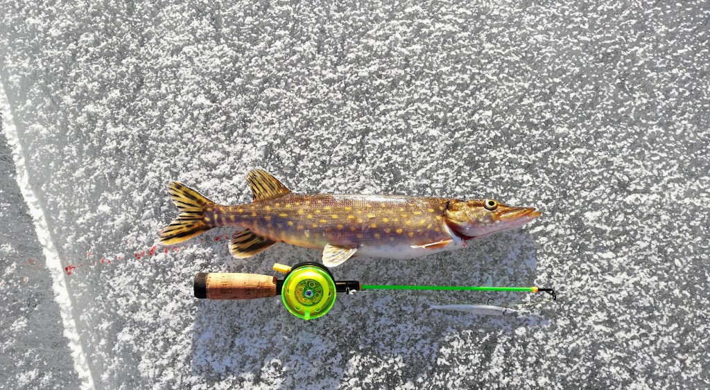 Seuraava paikka oli saaren päässä olevan vedenalaisen niemen kärki. Ja jos haukien määrä varsinkin suhteessa ahveniin on ollut tänä talvena kiero, sai se lopullisen niittinsä nyt: Neljällä perättäisellä reiällä odotti hauki! Yksi tärppäsi varovasti, toinen ilmestyi alle vain käväistäkseen ja kaksi muuta lähtivät jopa karkuun 8 cm jigiä…