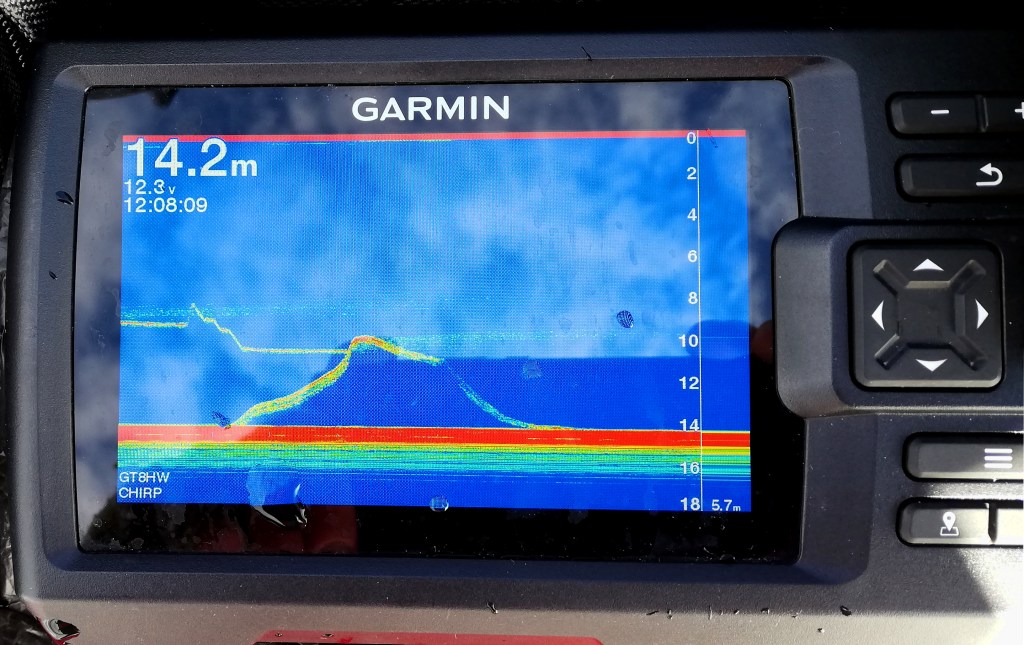 Yksi niistä monista tuon alueen paikoista oli jo hieman legendaarinenkin paikka, jossa saimme kunnian olla aamun ensimmäiset. Paikka on muodoltaan 6 – 9 m syvyinen kieleke todella syvän syvänteen reunalla. Aloitimme rannan tuntumasta 4 – 5 m vedestä, josta siirtyisimme tuolle kielekkeelle, joka se tämän paikan ”spotti” on.