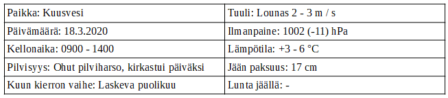 Keli oli kirkas. Vaikka aamulla taivas oli pilvinen, märkä jää heijasti valoa ja loisto puhkesi kukkaan päivällä pilvien väistyessä. Ilmanpaine oli tuttu pikkumatalapaine ja sellaisena se oli viime päivätkin pysytellyt. Lämpötila oli keväinen ja lämmin lounaistuuli teki siitä yhdessä auringon kanssa äkkiseltään jo kesäisenkin tuntuisen iltapäivällä. Jäätä oli 17 cm ja kuun kierto laskevan puolikuun vaiheessa.