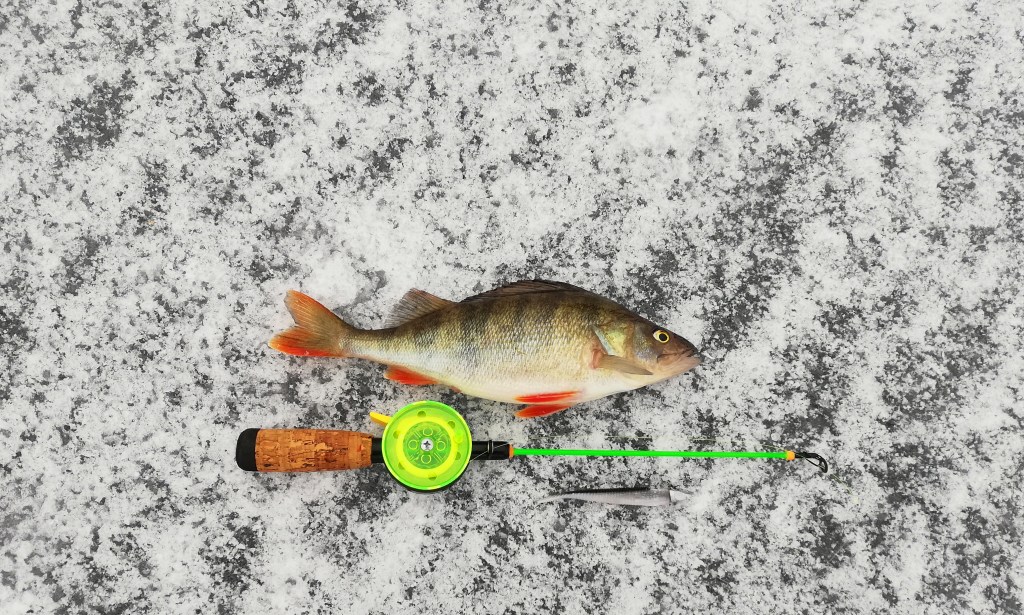 Pari houkutusvetoa 10 cm Sairalla saivat kalan ilmestymään alle. Hetken kyttäiltyään se nousi vauhdilla jigille. Tässä kohtaa en talven kokemuksien perusteella vielä innostunut, mutta ilman minkäänlaista empimistä kala myös tärppäsi ja jäälle nousi ensimmäinen kunnon ahven.