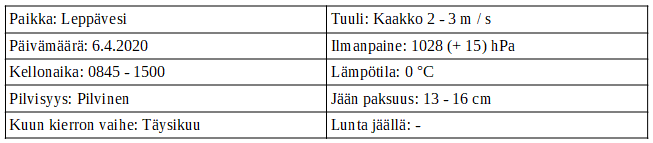 En saanut rauhaa ellen vielä kerran, yhden välipäivän jälkeen, kävisi Leppävedellä. Keli oli pysynyt suhteellisen viileänä ja tuo 13 – 16 cm jää tuskin heikentynyt. Mikä taas olisi väistämättä edessä seuraavina jopa + 15 lämpöasteen aurinkoisina päivinä. Lammetkaan eivät nyt oikein houkuttele, joten Leppävesi, vielä yhden kerran.