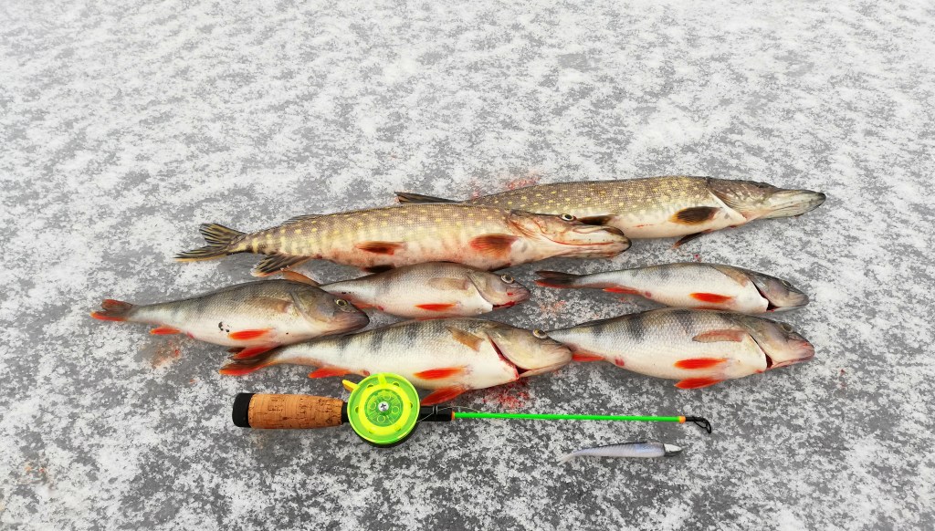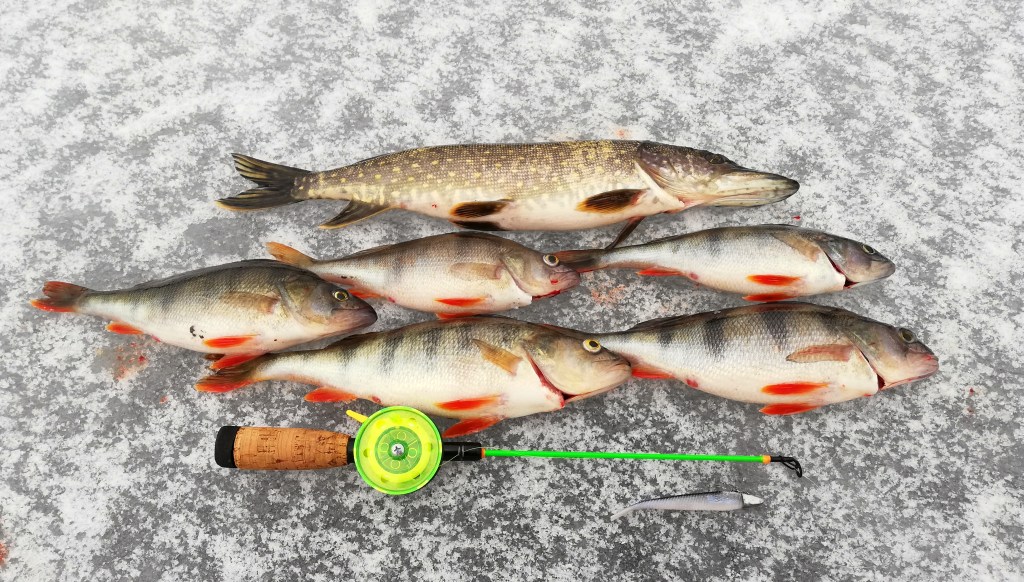 Uusi loppukuva ottoon ja eikö taas iskenyt jokin kiinni. Tällä kertaa hauki, joka ei selvinnyt vapautuskuntoisena, joten kolmas loppukuva ottoon. Kun vielä kolmas hauki keskeytti kuvan ottamisen, oli lopetettava ja todettava, että pienen tauon jälkeen ovat hauet taas valtaamassa tätäkin aluetta. Enää sillä ei tosin niin väliä, sillä ainakaan tuonne ei näillä jäillä enää pääsisi. Leppäveden pilkkitalvi oli osaltani tullut päätökseen.