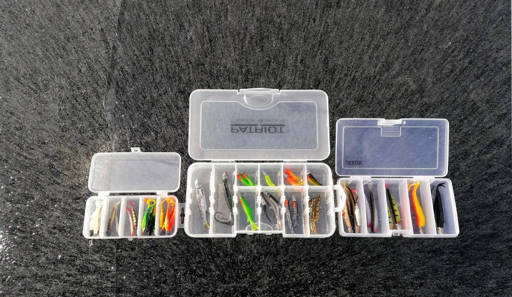 Vieheistä käytössä olivat erilaiset jigit: Mikadolta Saira 5 ja 8 cm koossa sekä Fishunter TT 5.5 senttisenä. Lisäksi Savage Gearin 3D Bleak Real Tail sekä tämän talven uutuudet Orka Small Fish 3 ja 5 cm koossa. Mallin ja koon lisäksi jaottelen jigit vielä karkeasti viiteen eri väriin: