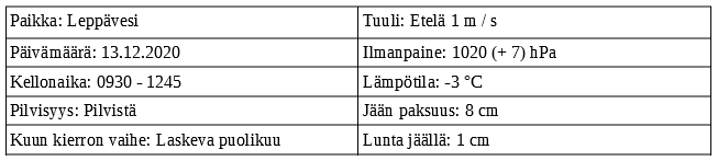 Keli oli yhä harmaa, joskin lumisade oli poissa. Pikkupakkanen kuten ilmanpainekin jatkui muuttumattomina edellispäivästä. Tuuli puhalteli kevyesti etelästä ja kuun kierto oli yhä laskevan puolikuun vaiheessa. Jäätä 7 – 8 cm ja lunta juuri ja juuri sen verran, että jään pinta oli valkoinen.