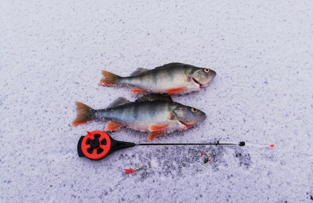 Muutama tyhjä reikä myöhemmin houkutteli 3D salakka kaksi ahventa paikalle. Varovaisten alkumerkkien perusteella tein nopean vaihdon morriin, joka kelpasi kaksikolle ja näin Leppävedenkin avauskalat oli saatu.