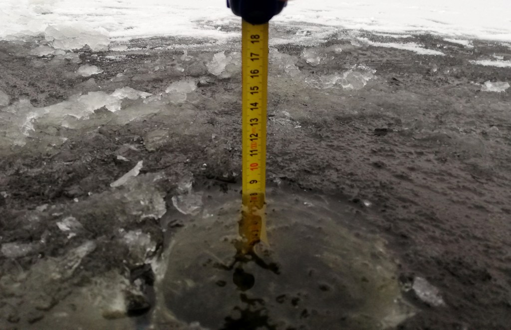 Kun koko ura sekä keskilinjakin oli kairattu, tuloksena kaksi ahventa ja ehkä viisi ylipäätään luotaimella nähtyä, en viimeisten tuntien syöntipiikkiin jaksanut enää uskoa ja lähdin pois. Seitsemän pilkkijän yhteistuloksen jäädessä reiluun kymmeneen kalaan voi varmuudella sanoa syönnin olleen huono. Ei se toki viimeksikään tämän paikan ensireissulla kummoinen ollut, mutta kuitenkin viisi ahventa ja ilman luotaimen apua.