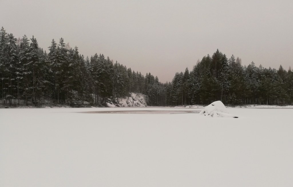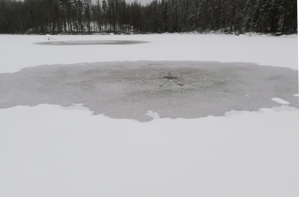 Siellä odottikin aikamoinen maisema. Jyrkkä kallioseinämä kapean lahden sivulla, josta myös aloituslampeen johtava puro sai alkunsa. Keskemmältä löytyi lisää ihmeteltävää, joskin negatiivissävytteisiä, kun jäässä näkyi kolme sulaa kohtaa. Kenties kiviä, sillä iso pintakivi näkyi myös lammen keskellä? Lähempi tarkastelu osoitti kohdat lähteiksi, mikä ei jäätilannetta ajatellen rohkaissut. Toisaalta lammen kalastolle lähteet voisivat tarkoittaa hyvää.