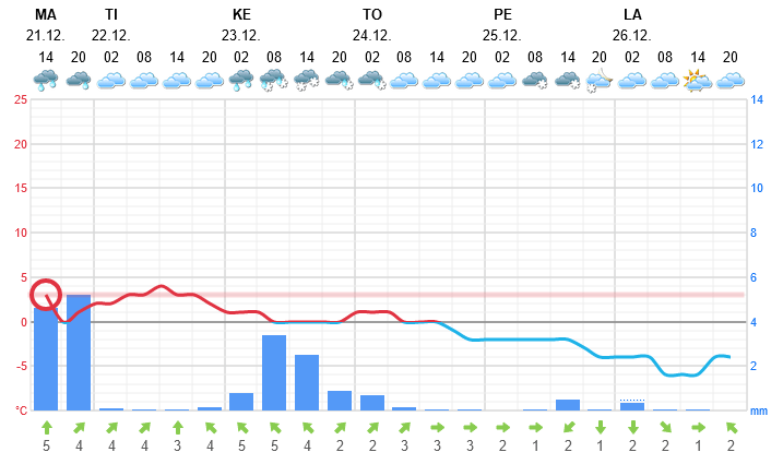 Sääennuste näyttää juuri nyt lohdulliselta ja toiveskenaario on tämä: Jään päällä oleva lumi sulaa vesisateissa jättäen jäälle sulamisveden tai korkeintaan märän loskakerroksen. Joulun jälkeen saapuvat pakkaset jäädyttävät tuon vesi- tai räntäkerroksen, jolloin jäätä syntyy kerrasta muutama sentti lisää. Lisäksi, ja ennen kaikkea, lumettomaksi tullut jää ottaa vastaan pikkupakkasenkin pureman ja vahvistuu entisestään. Toinen, myös mahdollinen ja ongelmallisempi tilanne olisi, jos povatut sateet kerryttävät lunta toiset 10 cm lisää.