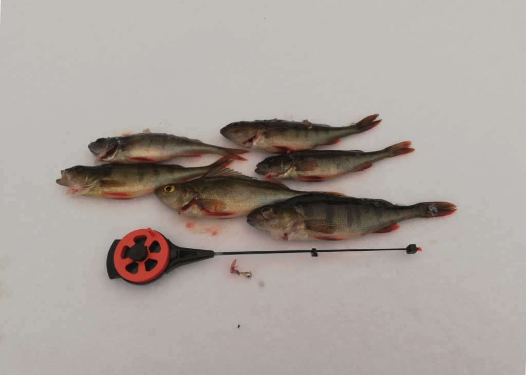 Aloitimme tasaisemmasta lahdesta. Vaihdoin valkoisen Sairan 3 cm Orka Small Fishiin hilemuikku värissä ajatellen sen olevan kirkkaassa vedessä hyvä. Heti toisella reiällä lahden suulla, 4 m vedessä, siihen tulikin tärppi. Vaati kuitenkin jälleen morria, että kalan sai kunnolla ottamaan. Avauskala oli päivän isoin, kuitenkin yhä alle 100 g. Muutama lisäreikä myöhemmin oli aika vaihtaa toiseen lahteen, isojen ahventen ollessa yhä hukassa.