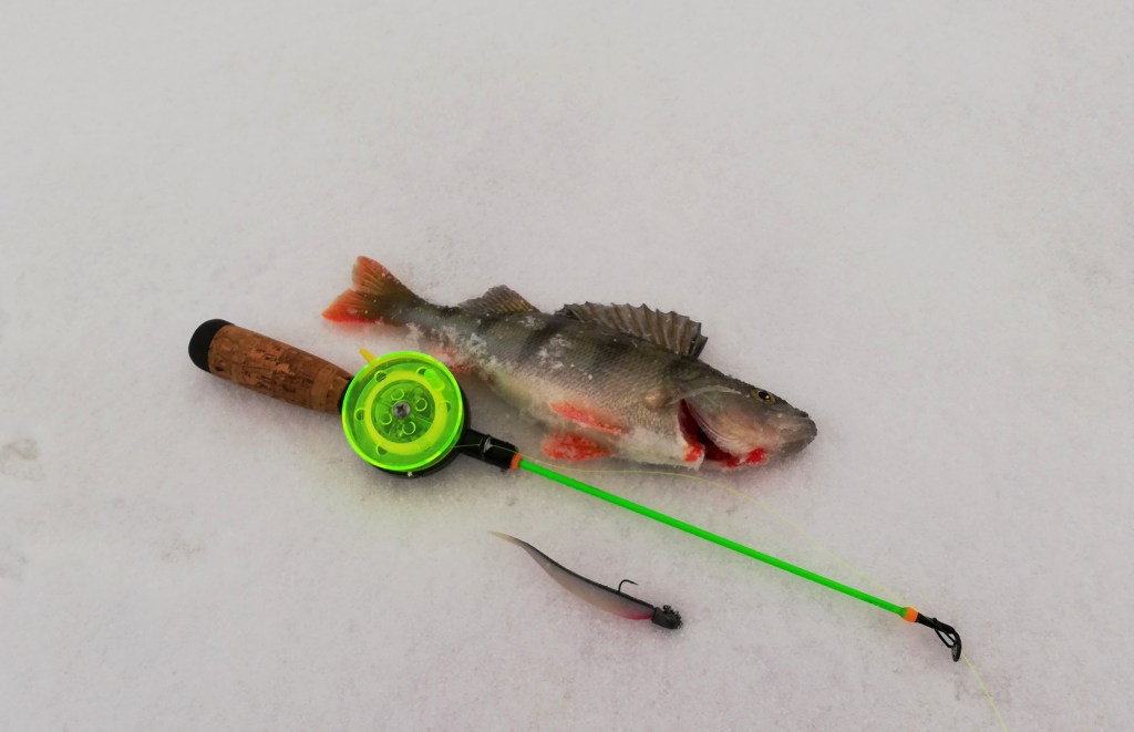 Vettä oli alla 6 m ja heti toisella reiällä ahven nousi mallikkaasti jigille väliveteen ja tärppäsi kerrasta. Sama jigi, sama syvyys ja sama selkä, kuin vuosi sitten. Kiertely ja jäänmittaus kannatti ja ottipaikoilla oltiin!